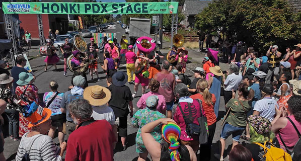 This year, the HONK! PDX FEST performed at the Montavilla Street Fair – here’s the famous Neon Brass Party entertaining.