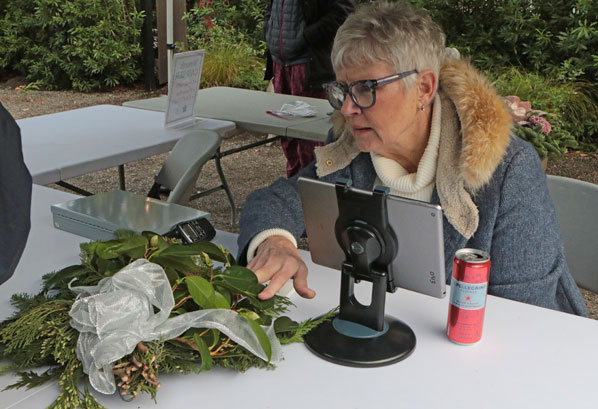 Volunteer cashier Kaye Fetscher rings up another wreath sale.