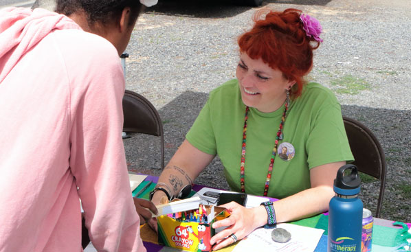At their organization’s booth, it’s Free Arts NW Board Chair Emily Trum – here, playing a “Pick a Color” drawing game with passing kids.