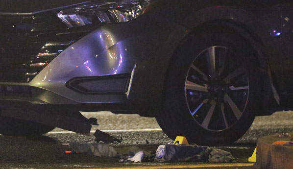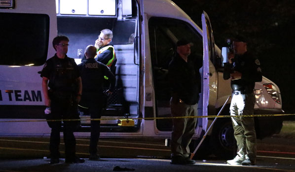 Police investigators talk with a woman, the vehicle’s driver, a witness, or another somehow involved, at the spot where the Nissan came to a stop in the northbound lanes.