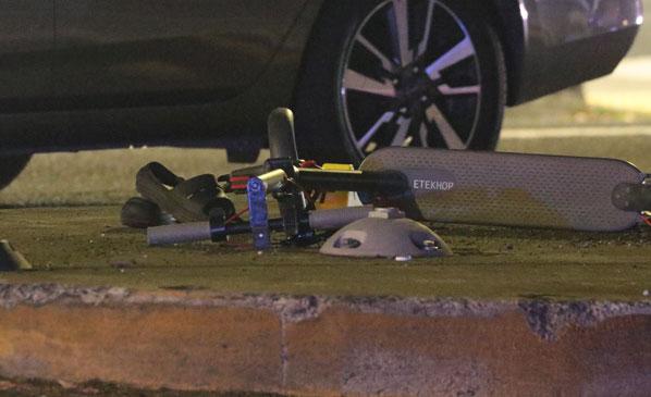 The boy’s broken “ETEKHOP” scooter lies on the pedestrian island after the crash.