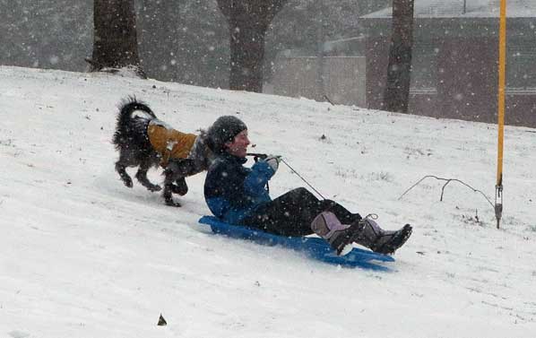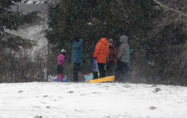 In the Powellhurst-Gilbert neighborhood, the heavy snowfall almost obscures a family having a winter outing in Raymond Park.
