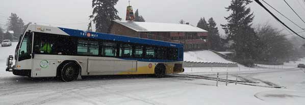 After skidding out on a hill, this TriMet bus gets stuck in the intersection, then backs down the slope and awaits help.