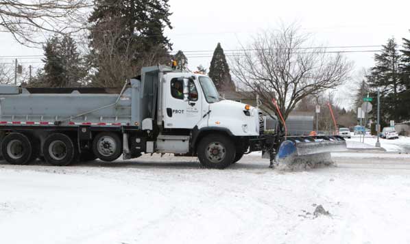 Portland Bureau of Transportation trucks, equipped with snow plows and sand spraying units, work to keep main travel corridors open.