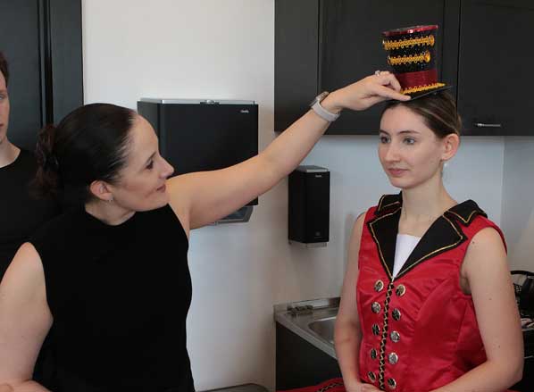 CBA Costuming Department Headpiece Manager Jennifer Martin fits a “wiglet” to student performer Faye.