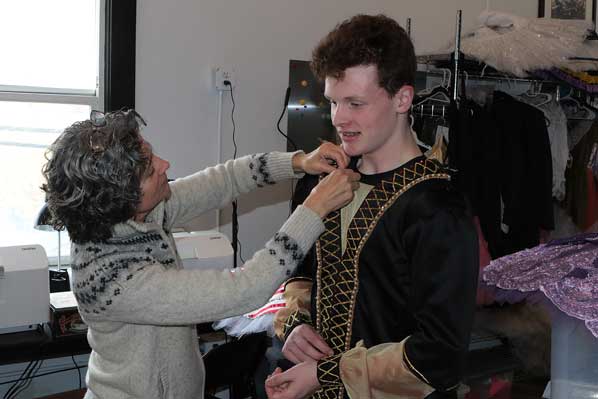 Costumer Cathy Ono checks the fit of a costume on student dancer Lane Harris.