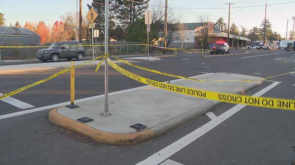 Huge, raised “pedestrian islands” and crosswalks on SE Division Street didn’t prevent this fatal collision. Courtesy KGW-TV 8 News