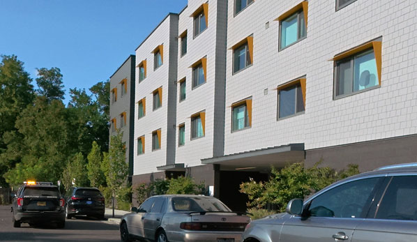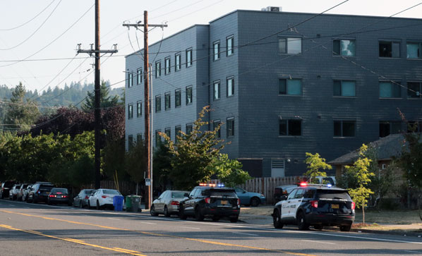 It didn’t take long for a total of 13 officers to arrive, all of their attention focused on the Powellhurst Place Apartments at 5415 SE 122nd Avenue – although one patrol car was “behind” the building, on a dead-end street – SE 121st Avenue.