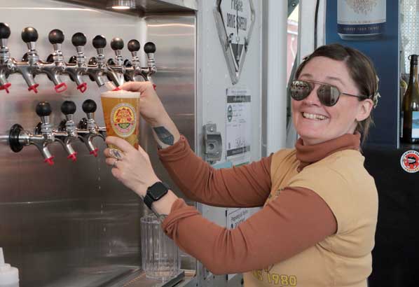Adult beverages? “You bet!” says Lauren Bozarth, as she’s pulling a beer at Thirsty Pours, in the Foster Food Carts beer garden.