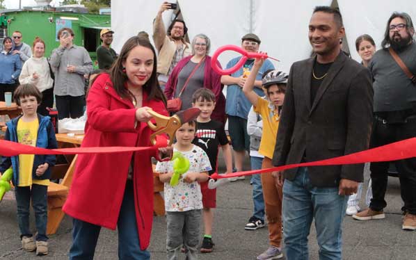 Portland District 3 City Councilor Angelita Morillo snips the ceremonial ribbon, signaling the official opening of the all-new Foster Food Carts, as owner Nik Badwaik looks on.