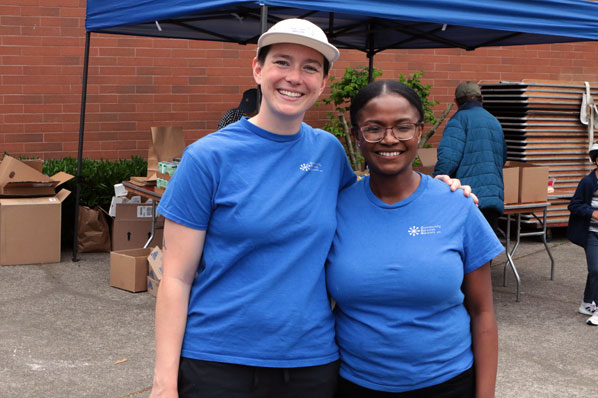 Welcoming people to the fair are Community Services Network Multnomah Outreach Coordinator Marin Ricketson, and Community Health & Engagement Specialist Berryl Omollo.