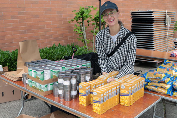 Assisting at the Free Food Pantry table is volunteer Amand Cilek.