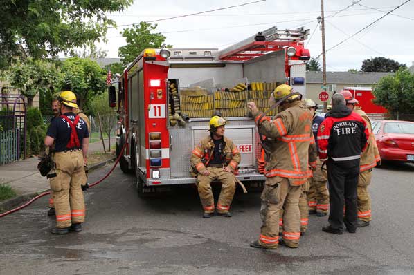 Firefighters from PF&R Station House 11 in Lents take a break after extinguishing the fire – and before they start hauling out burned debris.