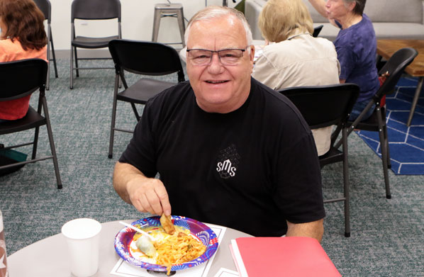 At the July, 2025 Lents Neighborhood Livability Association meeting, guests – here including Gary Sargent, of Sargent’s Motorsports – found the Thai menu of spring rolls, pot stickers, and pad Thai to be quite toothsome.