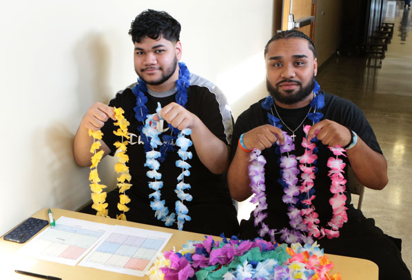 Welcoming guests with leis to the David Douglas School District Asian American Pacific Islanders Festival are students Wayne Paiau, and Rodison Ninger.