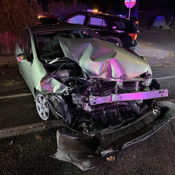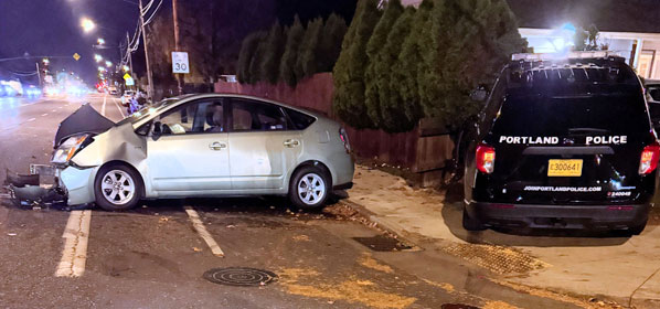 A suspected drunk driver in this Toyota Prius turned in front of a Portland Police cruiser –resulting in this nearly-head-on smashup that slammed the police car into a fence and bushes.