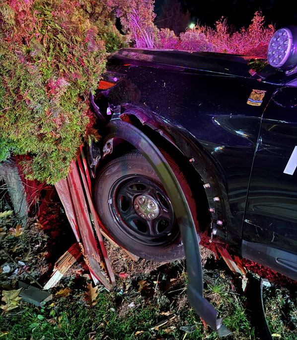 The crash was nearly head-on – but \ the officer at the wheel was able to brake, and lower the speed of the crash. Still, the impact pushed the patrol SUV into a fence, damaging the fence, some landscaping, and a vehicle parked in the driveway. Both involved vehicles had to be towed.