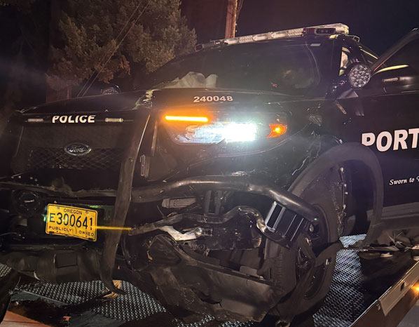But such was the case on Saturday, November 8, when PPB East Precinct officers reported to dispatchers at 7:15 p.m. that they’d been involved in a crash at NE Halsey Street and 29th Place, and requested emergency medical services.