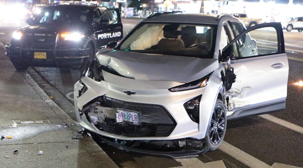 Between the building and the intersection along NE Glisan Street was a Chevy Bolt, airbags deployed, with extensive damage to the front of the electric car.