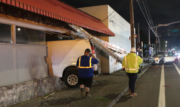 It was easy to spot the “structure” in question – it was distinguished by having a large Chevy Express work van, complete with extension ladders knocked off a roof rack, embedded halfway into it.