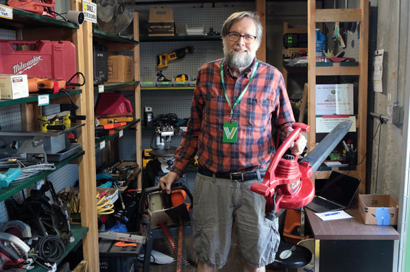 Checking in borrowed tools that were returned is Tool Library volunteer Phil Dekker.