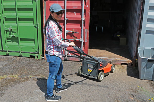 Reorganizing their selection of electric lawn mowers is volunteer Seph Irish.
