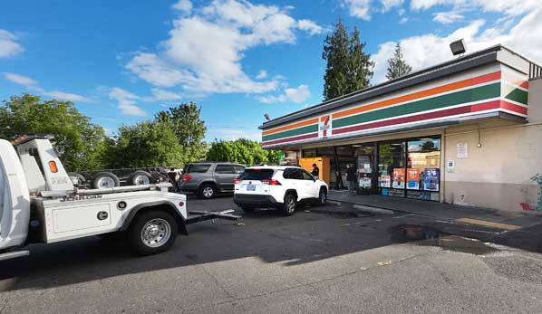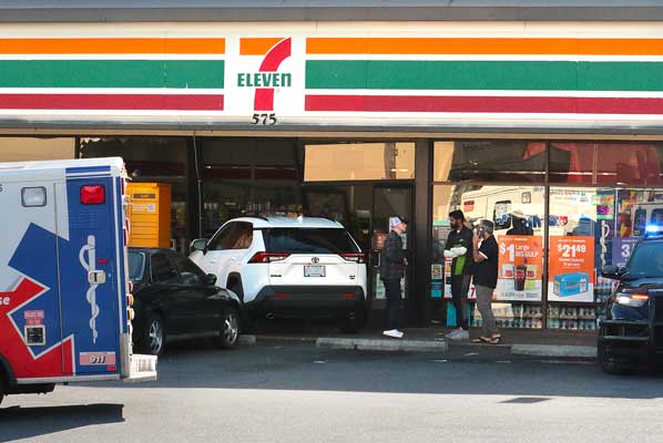 On the sunny Saturday afternoon of June 15th, patrons inside – and also outside – of the Montavilla 7-Eleven store on SE 92nd Avenue, in the short block between Stark and Washington Streets were shocked when a white Toyota Rav4 XLE ran up over a concrete parking lot “stop block”, and smashed right into the front of the store.