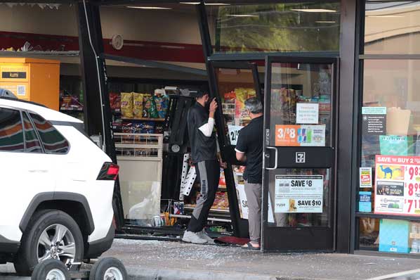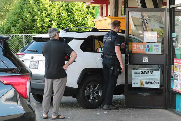 As the SUV is about to be hauled away, the convenience store’s worker and manager try to piece together their front windows and door.