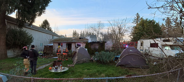 The burning house may have been unoccupied, but new-looking tents pitched in the yard, and the motor home in the side yard, indicate that people have been living on the property.
