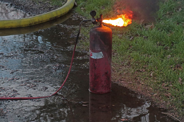It’s not known if this acetylene bottle, removed by a firefighter from the house – it still had flame coming out of where the valve had burned off – contributed to this fire.