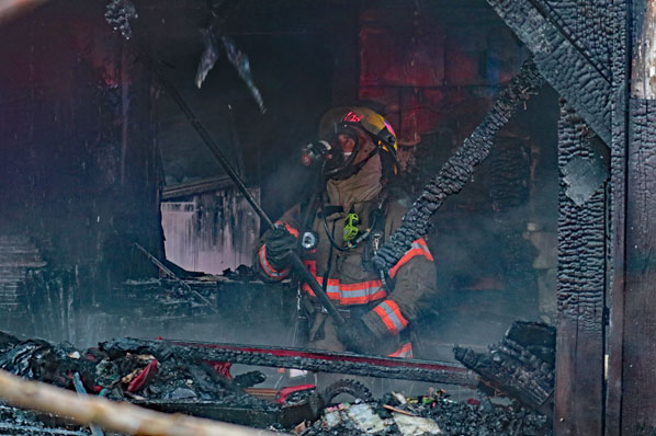 After the active fire has been extinguished, this firefighter uses his hooked “Pike pole” to dislodge charred wood, looking for hidden, active flames.