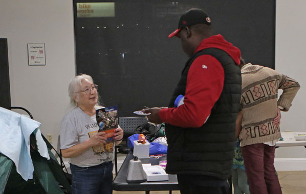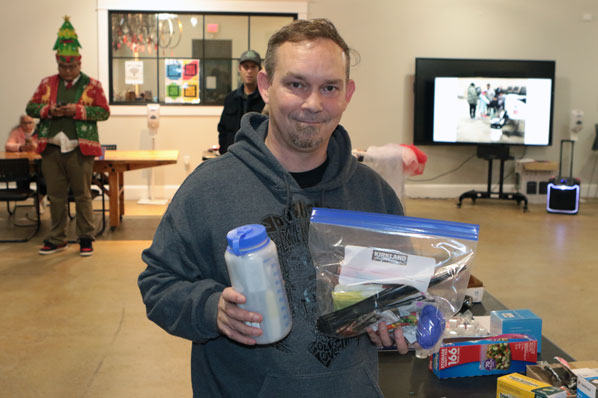 Centennial Community Association Chair David Linn, also associated with the Centennial Community Resiliency workgroup, gives guests a kit – a resiliency project funded by the City of Portland – containing 28 items, ranging from a poncho/emergency blanket, to a first aid kit, chlorine tablets for water purification, needle and thread, and a collapsible bag, all packed inside a water bottle!