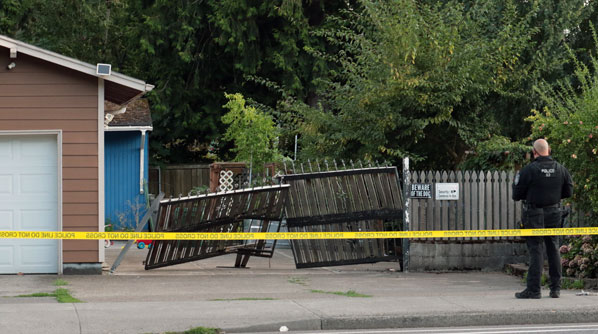 Yellow police tape was strung up in front of the house where the shot-up SUV was parked, just around the corner past the house at 14904 NE Glisan Street – where a wrought iron gate had been smashed in. Officials haven’t said how this might be related to the case, but it’s part of the investigation.