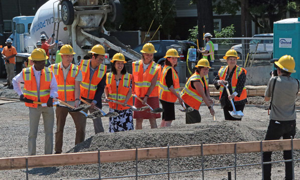 Posing for their “official” photographer at the site for the actual groundbreaking are Dele Oyemaja, Oregon Housing and Community Services (OHCS), Bill Van Vliet, Executive Director, Network for Oregon Affordable Housing, Duncan Hwang (District 6), Councilor, Metro, State Senator Khahn Pham (District 23), U.S. Congresswoman Maxine Dexter, M.D. (OR-3), Margaret Salazar, CEO, REACH Community Development, Jennifer Knapp, Executive Director, Community Vision, and, Helmi Hisserich, Director, Portland Housing Bureau.