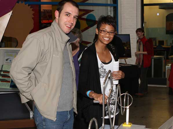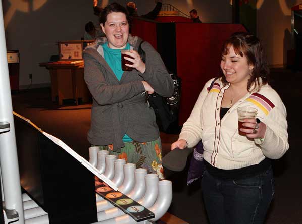 At OMSI After Hours, Jennifer Elliott watches Tiffany Dollar try her hand at playing the wacky “Wack-a-Phone”.