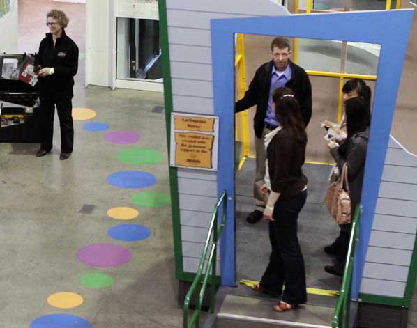 Earthquake! Kids shouldn’t have all the fun – here, grown-ups ride the “earthquake house” demonstrator.