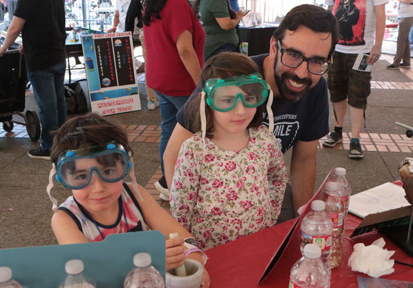 Benjamin and Charlotte, and their dad Brian Goldberg, have their safety goggles on for their experiments at this exhibit.