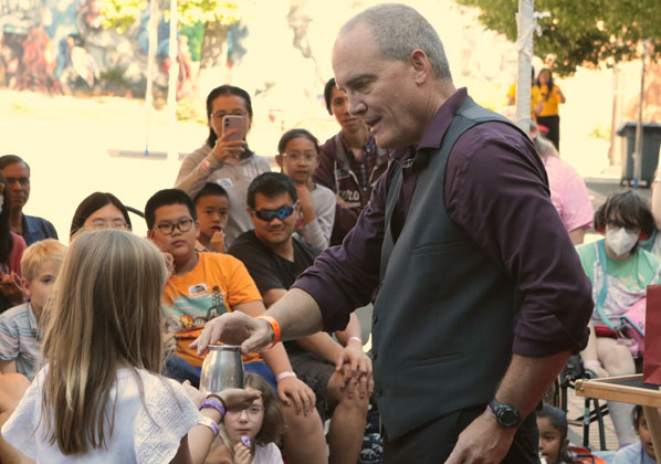 On their new “Curiosity Stage”, in OMSI’s front plaza, magician Jim Straight is one of the acts that delight large audiences.