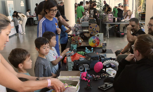 Visitors watch a 3D printer in action at the West3D exhibit.