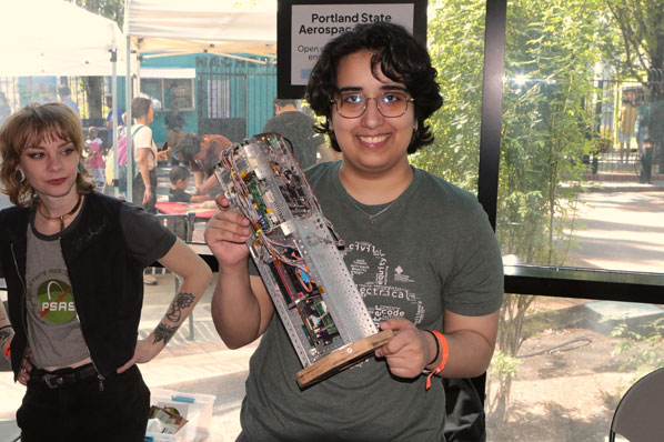 Portland State Aerospace Society member Hessah Alsaadon show the avionics, or the “brain”, of their LV2.3 rocket.