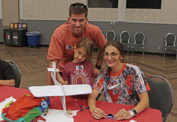 Proudly showing off the paper airplane they made in “Cardboard Creations”, while experimenting with electronics, is the Wackett family.
