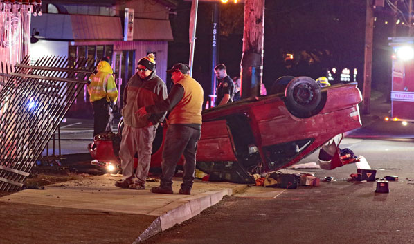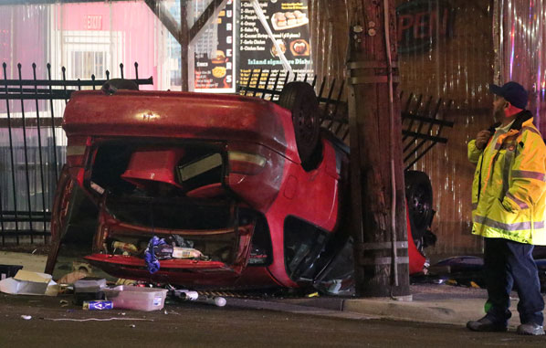 What these “ear-witnesses” heard was the sound of a single car smashup that left the vehicle on its top, on the sidewalk. What they didn’t hear was the sound of tires screeching on pavement before the crash.