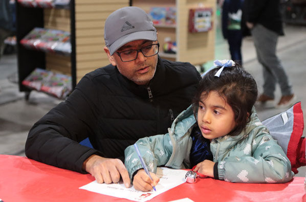Dad — Mr. Singh – watches, as his daughter writes a letter to Santa inside the ORHC Enginehouse.