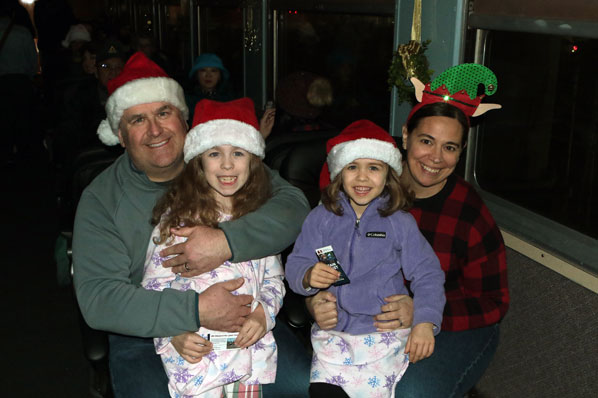 As another excursion is about to leave the station, “elves” Lucy and Sophia help Santa Claus greet guests and distribute candy canes.