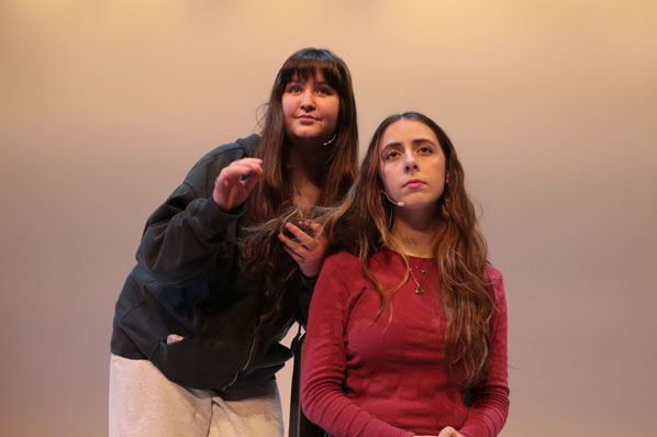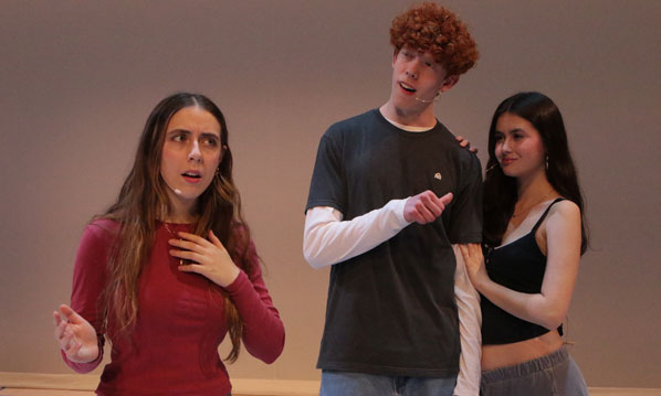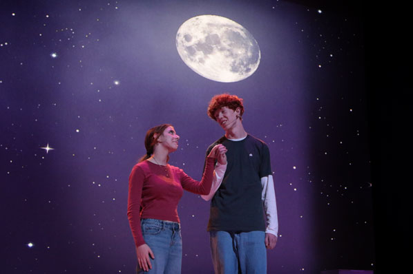 During rehearsal at DDHS of Legally Blond the Musical, Elle Woods (played by student actor Bella Pahomsky) hopes that her steady boyfriend, campus dreamboat Warner Huntington III (played by Caleb Conklin), will propose marriage before he heads off to law school.