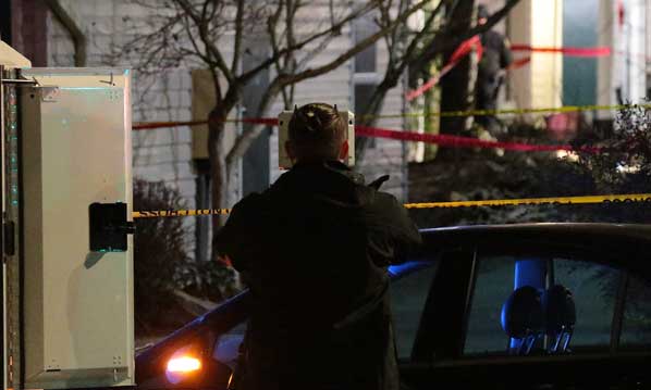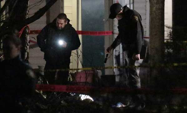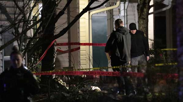 PPB officers, detectives and forensic investigators look for evidence outside an apartment unit – an area bounded by red crime scene tape.