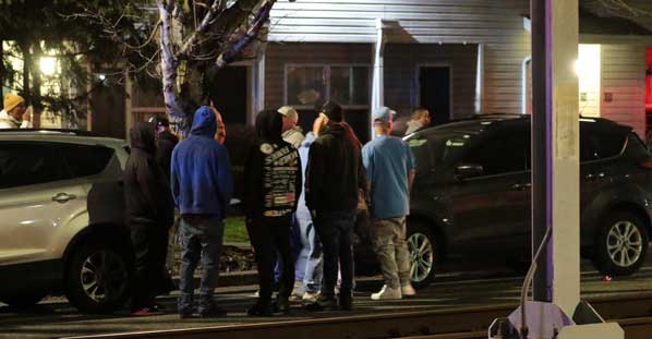 Apartment residents, witnesses, and perhaps family members, gather on the sidewalk outside the complex after the fatal shooting.