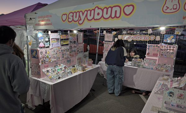 In addition to food, booths — like the “Suyubun” shop — sell stickers and other popular branded items.
