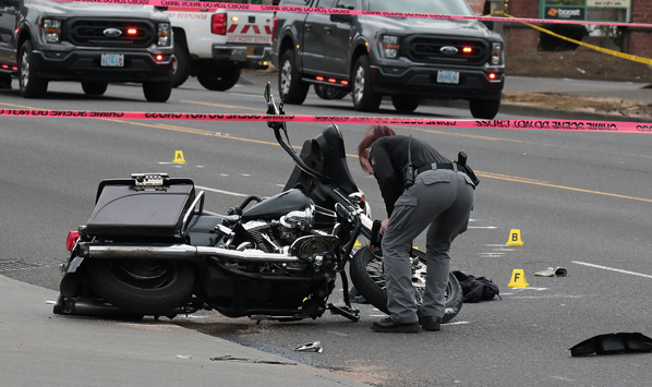 This officer with the PPB’s Major Crash Team takes a close look at the downed motorcycle.