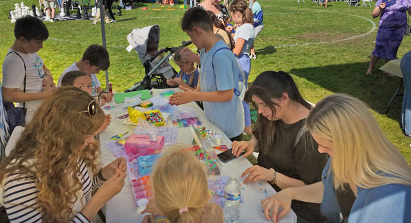 In the Crafts Pavilion, youngsters explore making beaded bracelets.